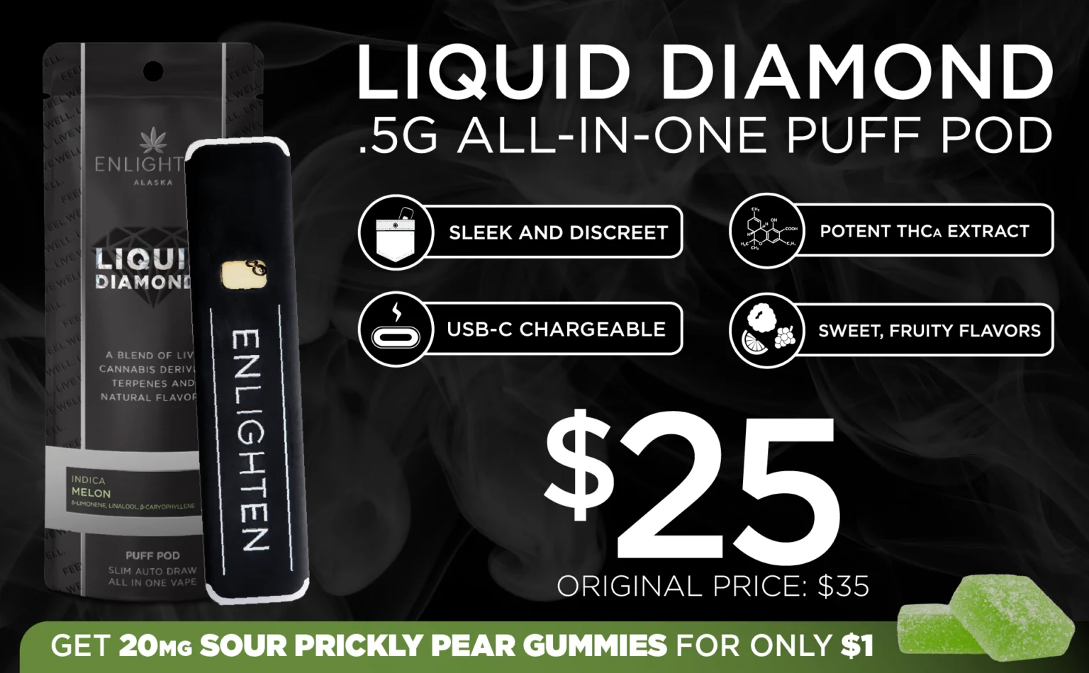 Enlighten’s Anchorage dispensaries are running a 420 raffle from April 1st through April 20th. Pick up a card at either location and complete 8 quick challenges in less than 10 minutes. Turn in your card by 4/20 for a chance to win the grand prize of a PuffCo Peak Pro 3DXL or two Alyeska Nordic Spa day passes! Every card is a winner with a $1 prize of your choice when you complete the last challenge.